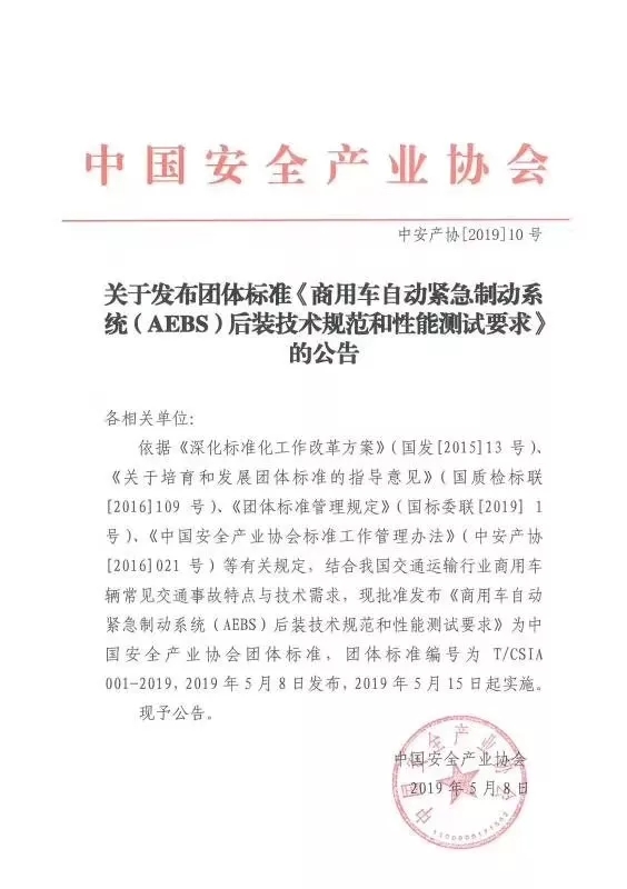 2019年5月8日,由中国安全生产协会发起,太阳集团主要参与制定的《商用车自动紧急制动系统AEBS后装技术规范和性能测试要求(T/CSIA001-2019)》正式发布,并将于2019年5月15日开始实施。