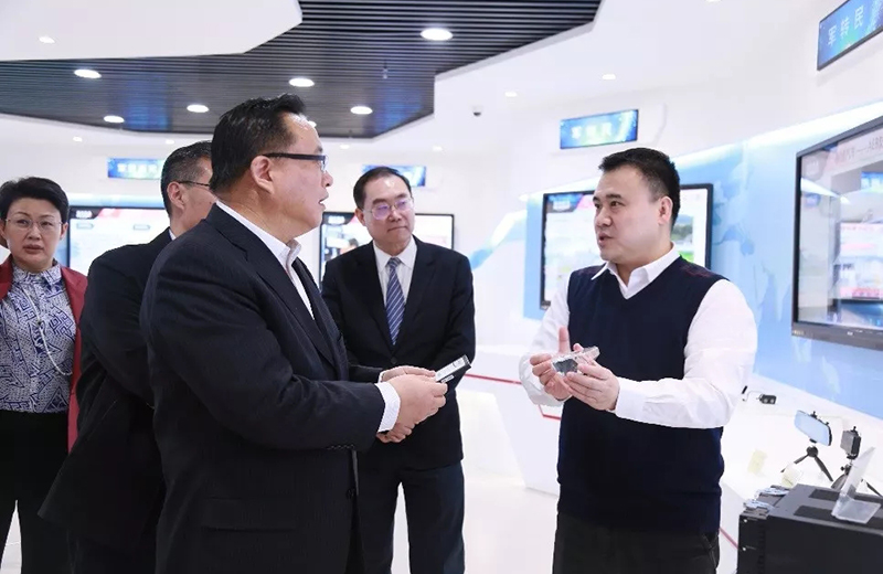 在展厅,高立宁副总经理向孙述涛市长一行详细介绍了太阳集团的发展历程、业务布局以及荣誉资质等相关情况。紧接着,高总从军转民、民参军、军民两用三个维度向孙市长展示了太阳集团在科技兴军的国家战略指导下,科技成果转化和产业化所取得的成绩。孙述涛市长重点了解了无人机侦察解决方案、北斗卫星导航应用解决方案、智慧汽车——77GHz毫米波汽车防撞雷达、安全存储应用解决方案等,并就相关技术问题和实际应用情况进行询问,高立宁副总经理逐一做出详尽解答。