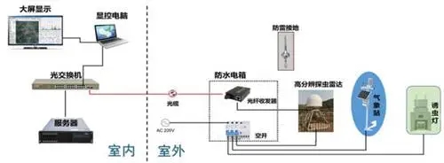 Ku波段高分辨全极化昆虫雷达 另外,基于以Ku波段高分辨全极化雷达为核心设备的昆虫迁飞侦诱系统,则集成了室外气象站,可测量雷达检测点环境,将探测数据输出至昆虫分析软件,实时对探测结果进行检测分析,显示昆虫迁飞态势。同时,该系统还配套了高空测报灯(简称:诱虫灯),并利用诱虫灯进行昆虫诱捕,可有效地减少有害昆虫对农作物的危害。